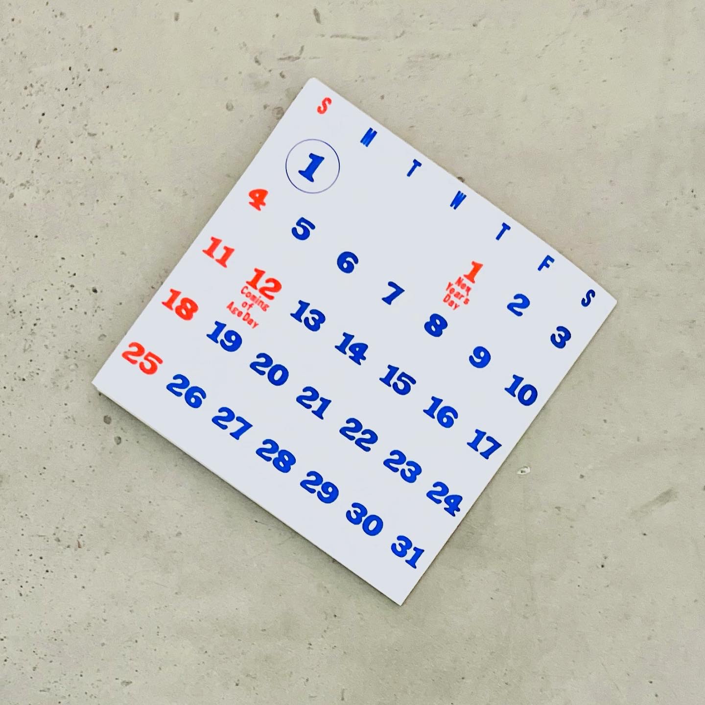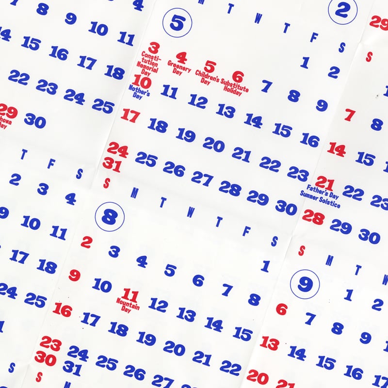 ポスタータイプのウォールカレンダーは、1年のボリューム感を眺めながら、1日をつかむのにちょうどいい大きさです。赤と青の2色で構成されており、毎日目にしても飽きがこないか検証を重ねてたどり着いたデザインだそうです。祝日ではないけれど覚えておきたい日も記されています。フォントは毎年変わっているそうですよ、今年はちょっと丸みのある文字です。毎年貼り替えるのが楽しみになりそうなカレンダーですね。12の月の境目となる折りスジもポイントになって見やすい仕様です。インテリアのアクセントとしてぴったりなカレンダーです。
