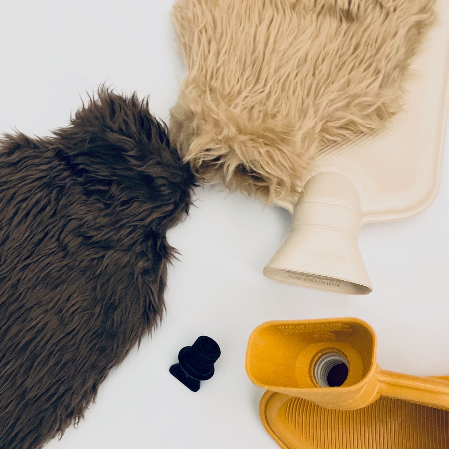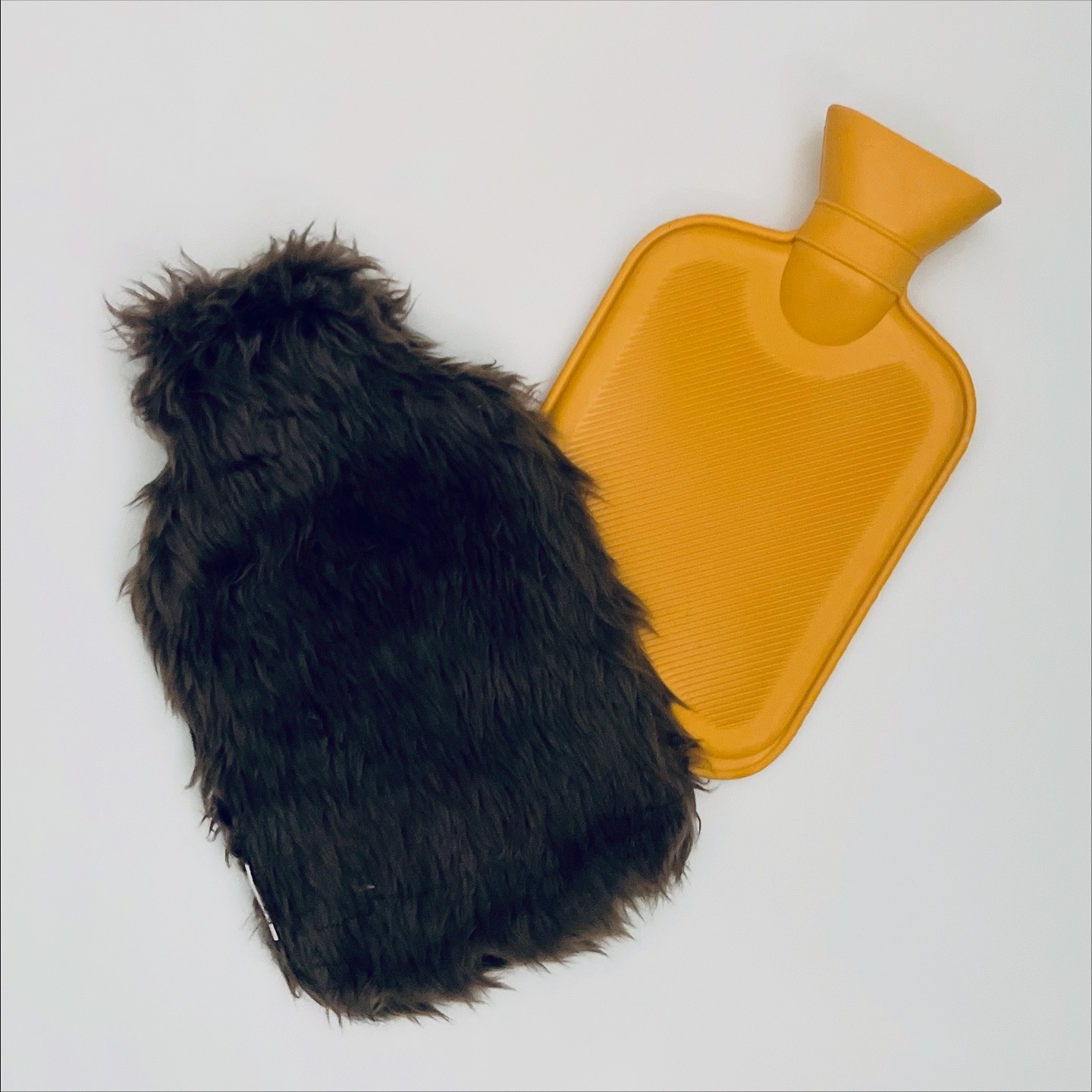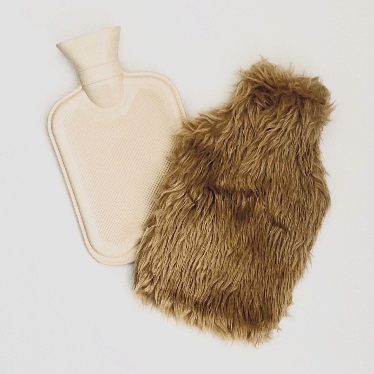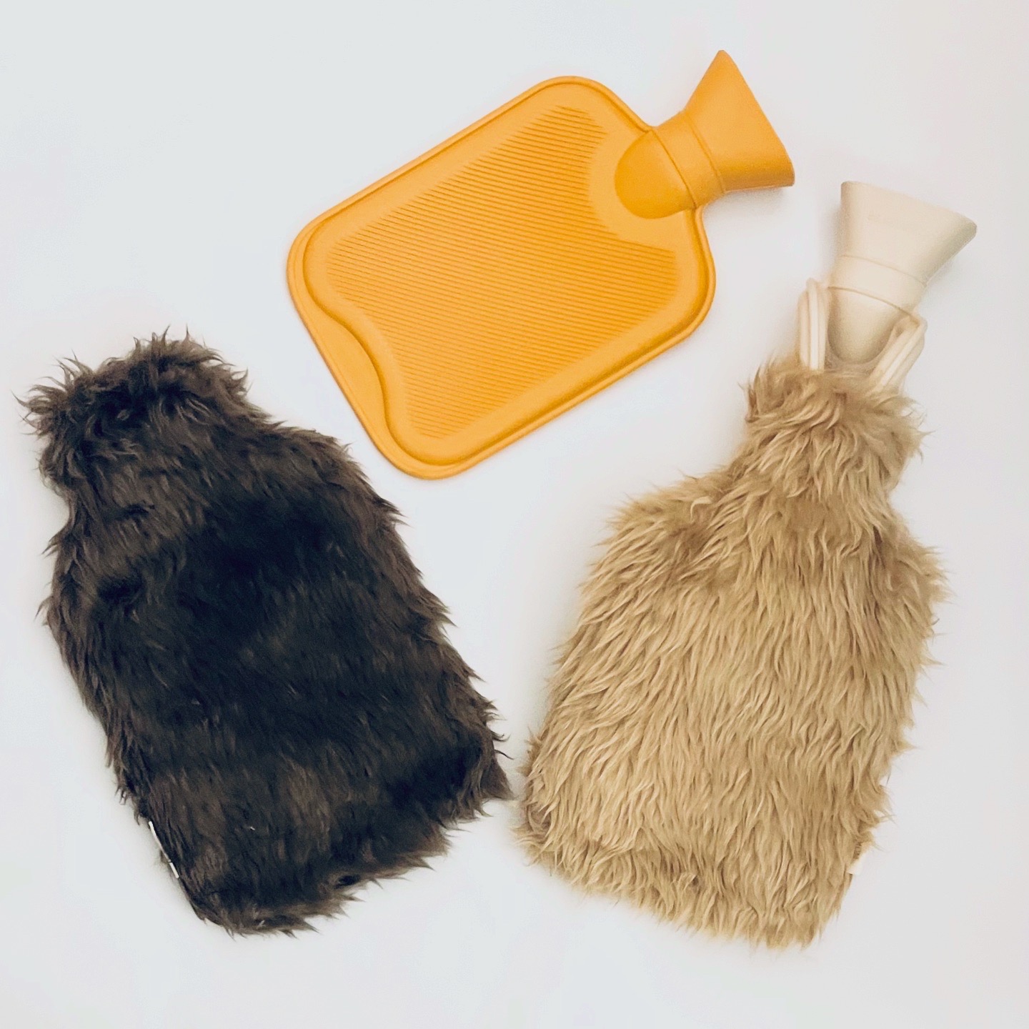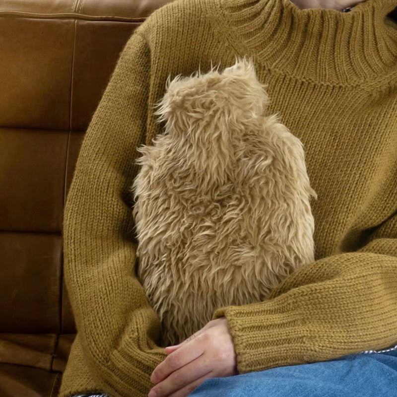 本体は柔らかな天然ゴム製、カバーはふわふわの毛足の長いフェイクファーを使用。小さなクッションのような見た目なので、ソファやベッド、リビングや寝室で置きっぱなしでもインテリアのアクセントになります。勉強や仕事中に膝の上に置いたりしても使いやすいサイズ感じです。
