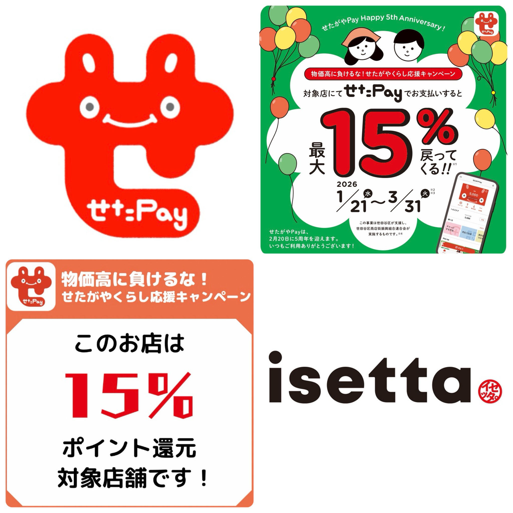 当店で「せたがやPay」のコインを使ってお買い物していただくと、お支払い額の15%のポイントが還元されます。ぜひ、せたがやPayでお得にお買い物してください。
